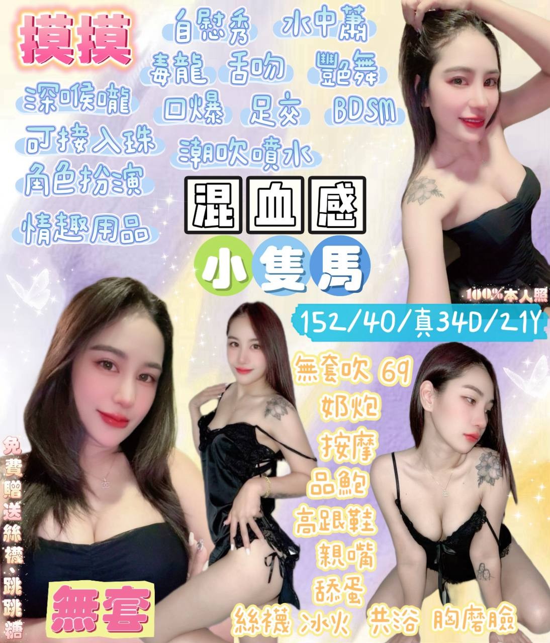 無套吹/奶泡/按摩/69/親嘴/舔蛋/冰火/殘廢澡/高跟鞋/絲襪/胸膜臉/深喉嚨/水中蕭/🉑️舌吻/🉑️口爆/🉑️角色扮演/🉑️足交/🉑️情趣用品/🉑️自衛秀/🉑️無套/🉑️雙飛