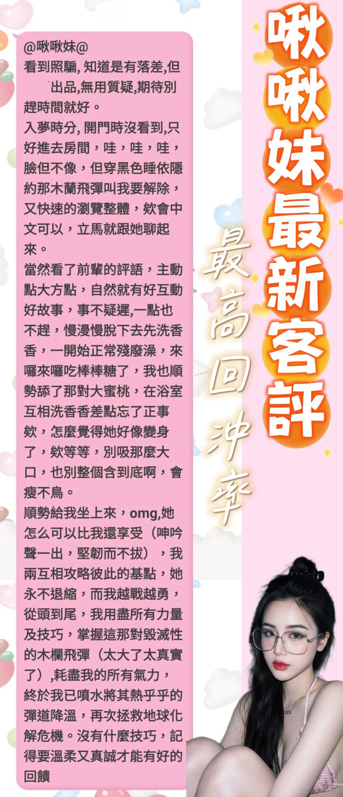 服務項目:共浴/無套吹/舌吻(視口腔清潔)/小親親/按摩/乳交/胸推/臀推/舔蛋/品鮑/69/角色扮演(性感內衣)…